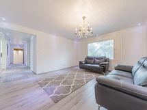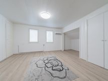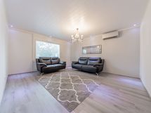 Valoisassa olohuoneessa on ilmalämpöpumppu, toinen ilmalämpöpumppu on yläkerran toisessa makuuhuoneessa.
