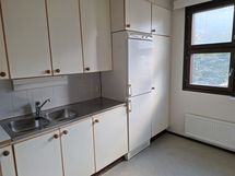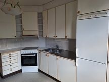 Liesi: keraaminen. Työtasot: laminaatti. Kylmäsäilytys: jääkaappi/pakastin. Varustus: liesituuletin / hormi.