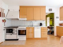 Jääkaappi, keraaminen liesi, liesituuletin, mikroaaltouuni, astianpesukone Rikki, kaapistot, irralliset kaapistot. Puuhella/uuni