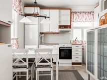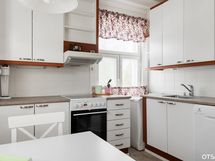 Keittiön varusteet: Jenkkikaappi, liesituuletin, astianpesukone, liesi, uuni ja pesukoneliitäntä. Liesi: Keraaminen liesi. Työtason materiaali: Laminaatti.
