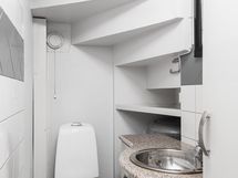 Pesutilojen varusteet: WC-istuin, pesuallas, allaskaappi, lattialämmitys ja suihku.