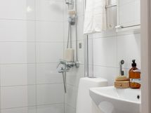 Bidee-suihku, pyyhepatteri. Varustus: suihkuseinä, wc-istuin, suihku, peilikaappi.