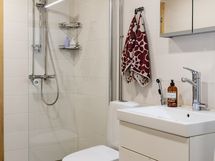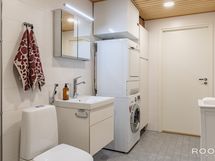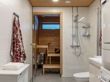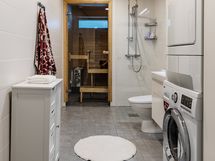- Pesutilojen kuvaus: Suihku, suihkuseinä, wc-istuin, pesukoneliitäntä, allaskaapisto, hana, peilikaappi, bidee-suihku ja lattialämmitys.