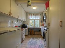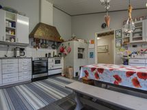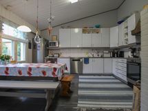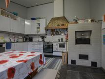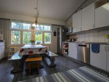 Liesi: keraaminen, puuliesi. Työtasot: laminaatti. Kylmäsäilytys: jääkaappi. Varustus: liesikupu, astianpesukone.