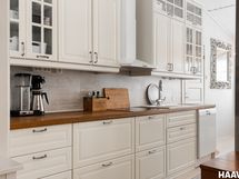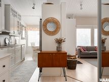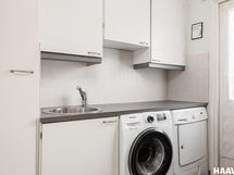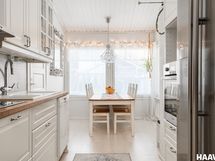 Vaalea ja kaunis keittiö tarjoaa erinomaiset puitteet ruoanlaittoon. Kodin pesu- ja saunatilat sekä kodinhoitohuone ovat hyvässä kunnossa, ja myös muita pintoja on päivitetty ajan mittaan, mikä luo siistin ja huolitellun kokonaisilmeen. Suurista ikkunoista tulvii sisään runsaasti luonnonvaloa, ja keittiön sekä olohuoneen korkea huonekorkeus tuo tilaan avaruutta ja ilmavuutta.