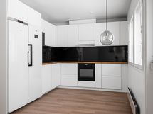 - Jääkaappi, pakastekaappi, erillisuuni Integroitu, liesitaso Integroitu, liesituuletin, mikroaaltouuni Integroitu, astianpesukone Integroitu, kiinteät valaisimet.