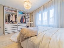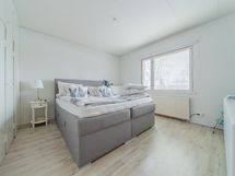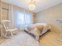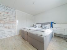 kaksi valoisaa makuuhuonetta, joista molemmissa kaapistoa, seinillä tapetti/lauta, lattioissa laminaatti