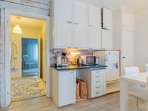 vaalea keittiö, jääkaappi, liesi, liesituuletin, keittiöön valoa tulvii kahteen ilmansuuntaan olevista ikkunoista, seinillä maali, laminaattilattia