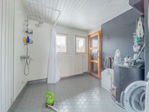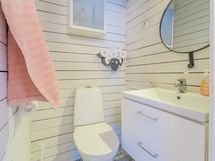 käynti kylpyhuoneeseen katetun terassin kautta, ikkuna, suihku, pesukoneliitäntä, seinillä laatta/paneeli, laattalattia. WC: peili, allas, allaskaappi, wc-istuin, seinillä paneeli, lattiassa muovimatto