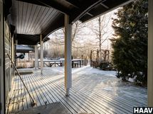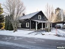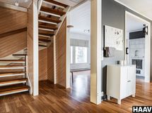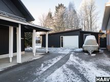 Tämä vuonna 2006 rakennettu puurakenteinen omakotitalo tarjoaa toimivat tilat kahdessa kerroksessa ja tyylikkään musta-valkoisen ilmeen.