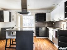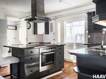 Musta-valkoinen keittiö saarekkeineen ja kivitasoineen on näyttävä ja toimiva – tilaa on niin arjen ruoanlaittoon kuin yhdessäoloon.