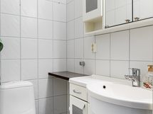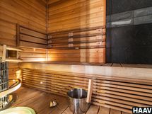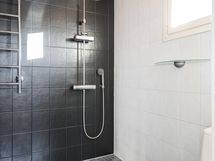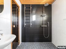 Pesutilat ovat tyylikkäällä musta-valkoisella ilmeellä ja saunassa varaus myös puukiukaalle.