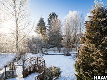 Kompakti piha on luonnonläheinen ja rajautuu lähelle Harjunpäänjokeen – maisema ja rauha ovat täällä osa arkea.