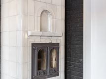 Olohuoneessa suuret ikkunat tuovat runsaasti luonnonvaloa, ja valkoinen takka luo tunnelmaa sekä lämpöä.