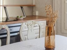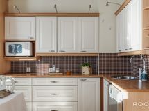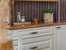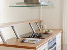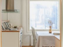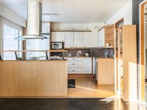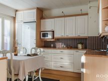 - Keittiön varusteet: Jääkaappi, astianpesukone, erillisuuni, liesi ja keittiösaareke. Liesi: Induktioliesi. Työtason materiaali: Laminaatti.
