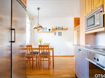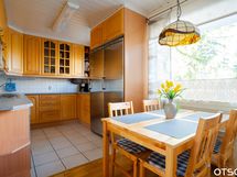 Keittiö on suunniteltu arjen sujuvuutta ajatellen: runsaasti lasku- ja säilytystilaa tekee ruoanlaitosta miellyttävää ja käytännöllistä.