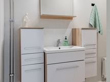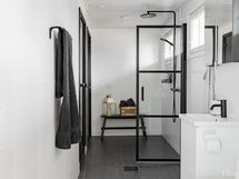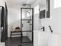 Varusteet: suihku, suihkuseinä, peilikaappi, allaskaappi, kiinteät valaisimet, WC, lattialämmitys. WC: Toinen wc pesuhuoneen yhteydessä. Varusteet: lattiaan asennettu WC, peili, allaskaappi