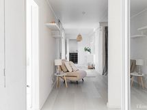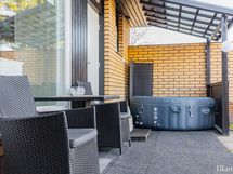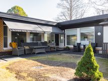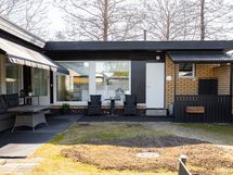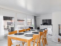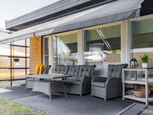 Asuntoon tulvii valoa suurista ikkunoista. Sisäpiha on suojaisa, ja osa terassista katettu valokatteella, ja osa markiisein. Varastotilaa on paljon: vaatehuone, kaapistoja, pihavarastoja.