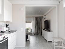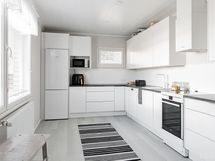 Varusteet: jääkaappipakastin, astianpesukone. Työtaso: laminaattitaso. Liesi: induktioliesi, liesituuletin suodattimella. avokeittiö