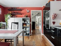 - Jääkaappi/pakastin, mikroaaltouuni, erillisuuni- ja taso (keraaminen), kaapistot, astianpesukone, liesikupu/-tuuletin. Lattia: Parketti