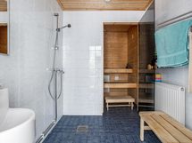 - Erillinen wc (2 kpl), lisäksi wc-istuin kylpyhuoneessa, kylpyhuone, suihku, pesukoneliitäntä (kodinhoitohuoneessa), sähkösauna. Lattia: Laatta. Seinät: Laatta