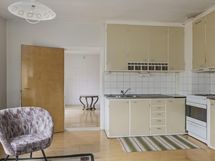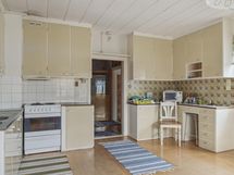 Jenkkikaappi, sähköliesi, liesituuletin (hormiin), kaapistot, kiinteät valaisimet, pöytätasojen materiaali (laminaatti).