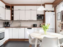 - Keittiön varusteet: Jääkaappipakastin (Uusittu 2024 syksyllä), astianpesukone, liesi, uuni ja liesituuletin (Uusittu 2024 syksyllä). Liesi: Keraaminen liesi. Siisti, toimiva keittiö, jossa paljon kaapistoja. Kaapistot maalattu 2v sitten.
