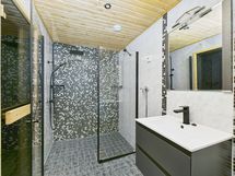 Varustus: suihkuseinä, pesukoneliitäntä, wc-istuin, suihku, peili, kiinteät valaisimet, kylpyhuonekaapisto.
