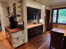 - Tilaa isolle ruokapöydälle, Paljon kaappitilaa, Paljon työskentelytilaa, Puutasot, Astianpesukone, Liesi tai uuni erikseen, Liesituuletin, Jää-pakastinkaappi, erillinen apukeittiö, jossa runsaasti säilytystilaa, erillinen avara ja tilava ruokasali. Keittiössä patterit, muualla lattialämmitys alakerrassa. Keittiöstä oma sisäänkäynti pihalle