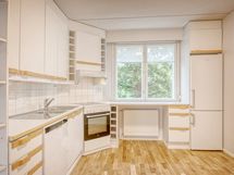 - Keittiön varusteet: Jääkaappipakastin, liesi, astianpesukone ja liesituuletin. Liesi: Keraaminen liesi. Työtason materiaali: Laminaatti. Vaaleat kaapistot, liesi, jääkaappi-pakastin ja ap-kone.