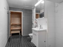 - Sauna, sähkökiuas, kylpyhuone, suihku, peilikaappi, allaskaappi, pesukoneliitäntä, lattialämmitys, kiinteät valaisimet.