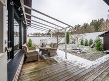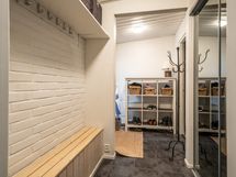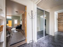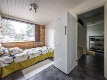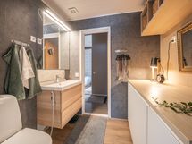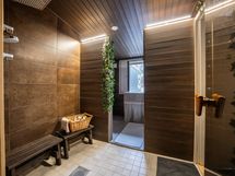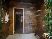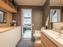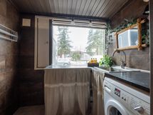 - Pesutilojen kuvaus: Pesuhuoneessa suihku, lattia ja seinät laattaa. Saunassa sähkölämmitteinen kiuas, lattia laattaa ja seinät puuta. Kodinhoitohuoneessa työtasoa ja käsienpesuallas, pesukoneliitäntä, lattia ja seinät laattaa. WC:ssä käsienpesuallas ja allaskaappi, ylähyllykkö, työtasoa ja alakaappeja sekä wc-istuin, lattia ja seinät laminaattia.