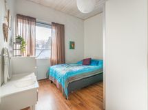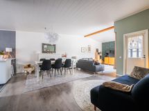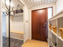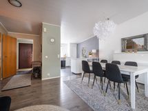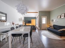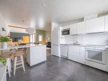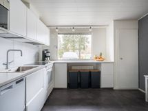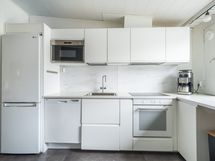 - Kaapisto: Valkoinen laakaovi, laminaattitasot ja välitilalevy. Kodinkoneet: Jääkaappi/pakastin, induktioliesitaso, erillisuuni, liesituuletin, astianpesukone.