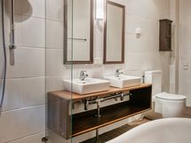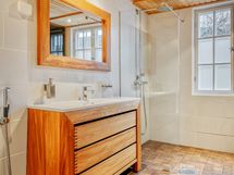 - Pesutilojen varusteet: WC-istuin, suihku, kylpyamme, suihkuseinä, lattialämmitys, pesuallas, allaskaappi ja peili. Pesutilojen kuvaus: Kahdet erilliset pesutilat.