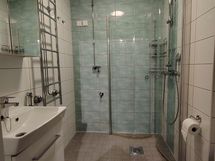- Suihkuseinä, Suihku, Pesukonevalmius, Peilikaappi, Allaskaappi, Rättipatteri, Laattalattia, Laattaseinä, Lattialämmitys