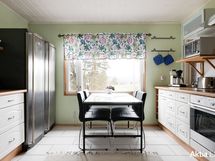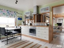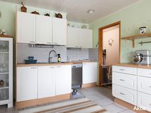 Liesi: erillisuuni, liesitaso. Työtasot: laminaatti. Kylmäsäilytys: jääkaappi, pakastin. Varustus: liesituuletin, astianpesukone, kiinteät valaisimet.