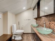 - Pesutilojen varusteet: Suihku (Kaksi sadesuihkua). Erillisten WC:n lukumäärä: 2. Erillisen WC:n varusteet: WC-istuin, pesukone, kuivausrumpu, pesukoneliitäntä, lattialämmitys, peili, pesuallas, allaskaappi, bidee-suihku ja lattiakaivo. Erillisen WC:n kuvaus: Kummassakin kerroksessa wc.
