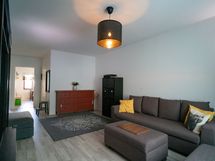 - Keittiön varusteet: Jääkaappipakastin, uuni, liesi ja astianpesukone. Liesi: Valurautaliesi. Työtason materiaali: Laminaatti.