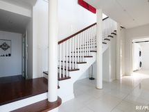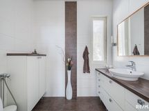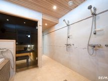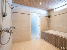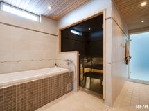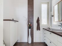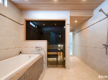 - Pesutilojen varusteet: 2 suihkua, lattialämmitys ja kylpyamme. Pesutilojen kuvaus: Ikkunallinen pesutila sijaitsee alakerrassa saunan yhteydessä. Pesutilasta on käynti kodinhoitohuoneen kautta ulkoterassille sekä suoraan takkahuoneeseen. Erillisten WC:n lukumäärä: 2. Erillisen WC:n varusteet: WC-istuin, lattialämmitys, pesuallas, allaskaappi, lattiakaivo, bidee-suihku, peili ja kapea, korkea ikkuna. Erillisen WC:n kuvaus: Alakerran wc varusteet: