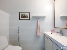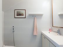 Wc-istuin, bideesuihku, peili, laminaattitaso, käsienpesuallas sekä allaskaapisto.