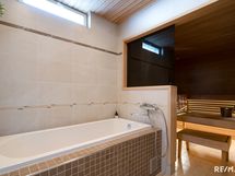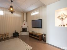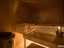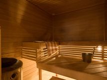 - Kiuas: Sähkökiuas. Tilava sauna, jossa osittainen lasiseinä, sekä lasiovi.