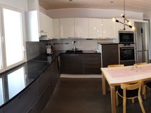 Tilaa isolle ruokapöydälle, Paljon kaappitilaa, Paljon työskentelytilaa, Suuri tiskipöytä, Lasikaapit, Kivitasot, Astianpesukone, Integroidut koneet, Induktioliesi, Liesikupu, Jää-pakastinkaappi