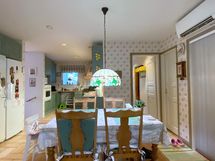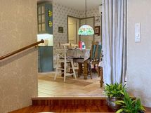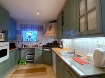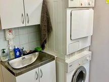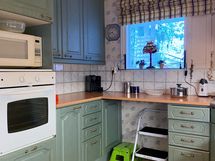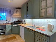 askelta muita oleskelutiloja ylemmäksi; keittiössä kylmälaitteet, sähköuuni, keittotaso, liesituuletin, astianpesukone, kaapistot.