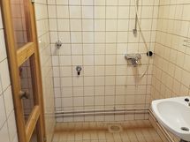 Hyvä kylpyhuone pesukoneliittymällä. Oma sauna
