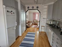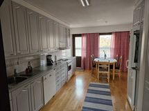 Tilaa isolle ruokapöydälle, Paljon kaappitilaa, Lasikaapit, Suuri tiskipöytä, Laminaattitasot, Astianpesukone, Pesukoneliitos, Sähköliesi, Liesituuletin, Jää-pakastinkaappi
