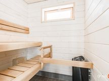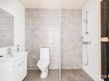 Sauna, sähkökiuas, kylpyhuone, suihku, suihkuseinä, peilit, allaskaappi, pesukoneliitäntä, lattialämmitys, kiinteät valaisimet. Kylpyhuoneen yhteydessä wc-istuin.