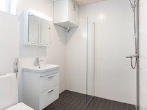 Pesutilojen kuvaus: Varustus: suihkuseinä, pesukoneliitäntä, lattialämmitys, wc-istuin, suihku, peili.