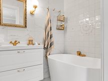 Badrum uppe: vägg stängd, handmålat kakel, fristående badkar, ny toalett och handfat