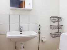 Pesutilojen kuvaus: Vaatimaton pesutupa ja puulämmitteinen sauna kellarissa. Varustus: kylpyamme, suihku. Varustus: bidee-suihku.