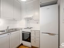 - Keittiön varusteet: Jääkaappipakastin, liesituuletin ja liesi. Liesi: Sähköhella. Työtason materiaali: Laminaatti ja metalli.